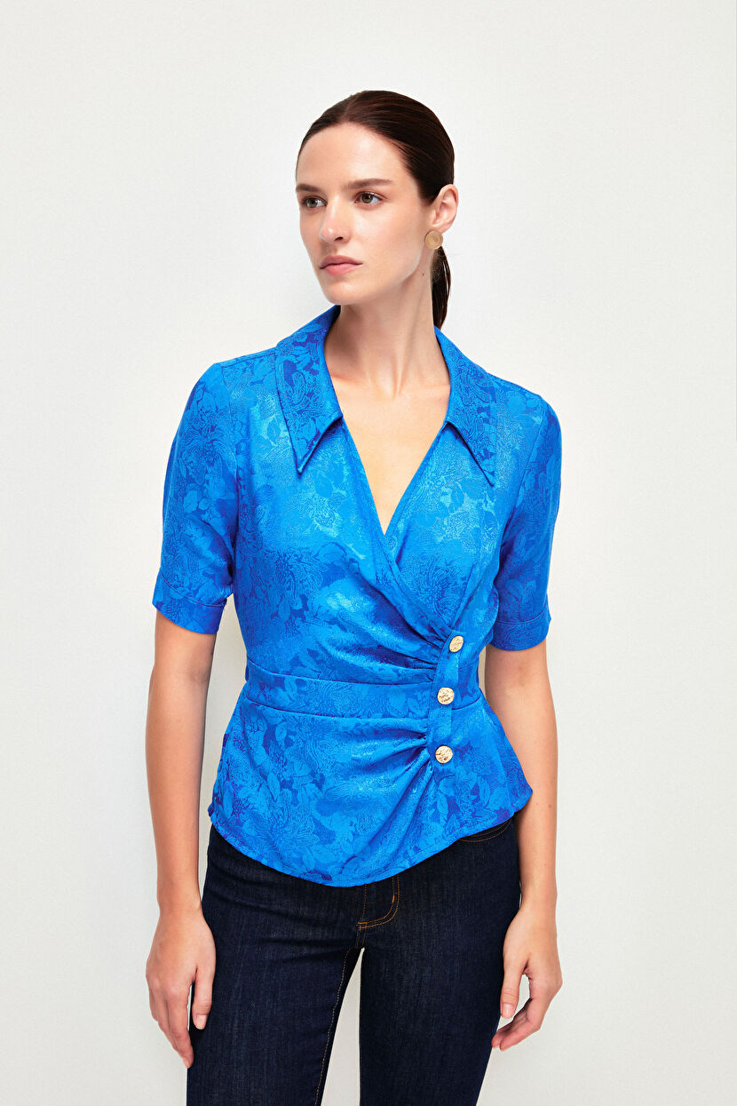 Blue Shirred Short Sleeve Blouse