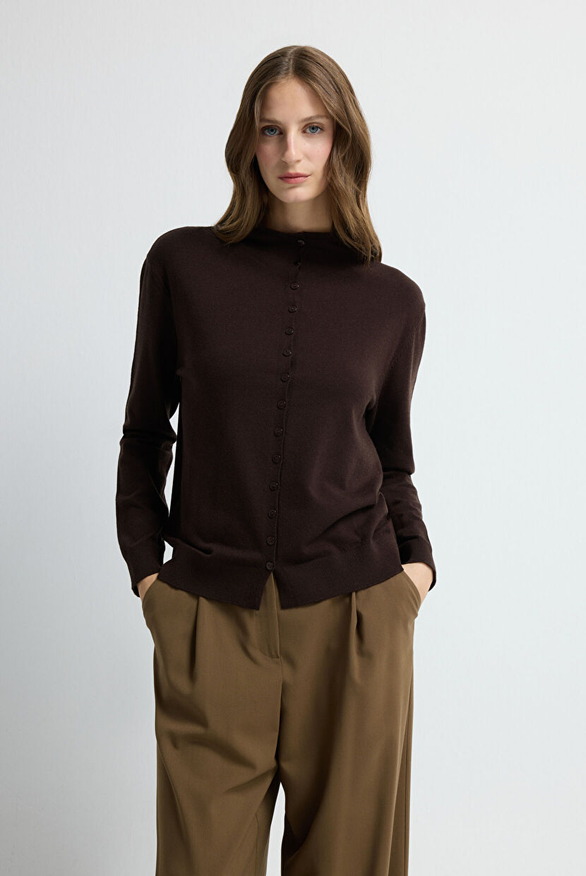 Brown Stand Collar Buttoned Sweater Cardigan