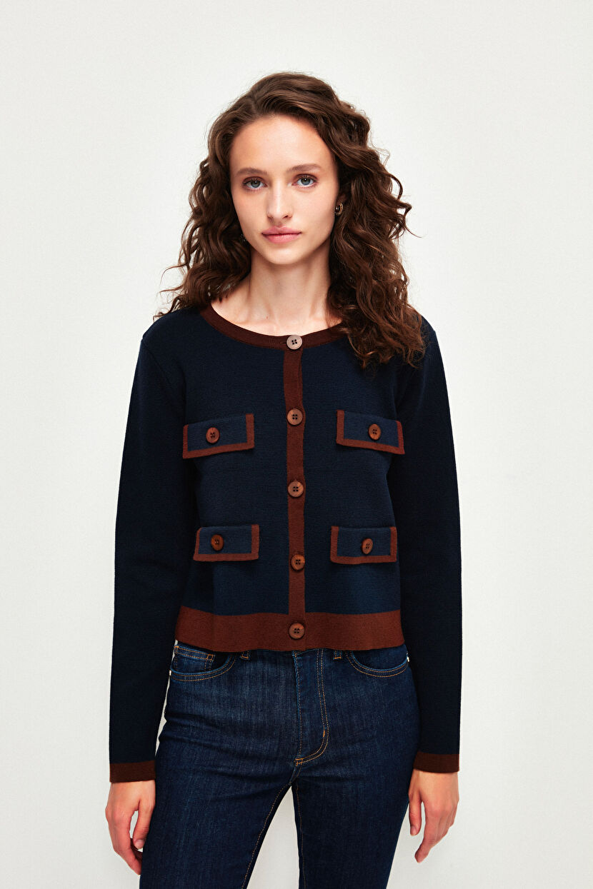 Navy Blue V Neck Button Detailed Knitwear Cardigan