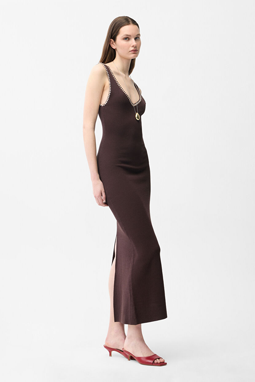 Brown Knitwear Dress with Embroidered Collar