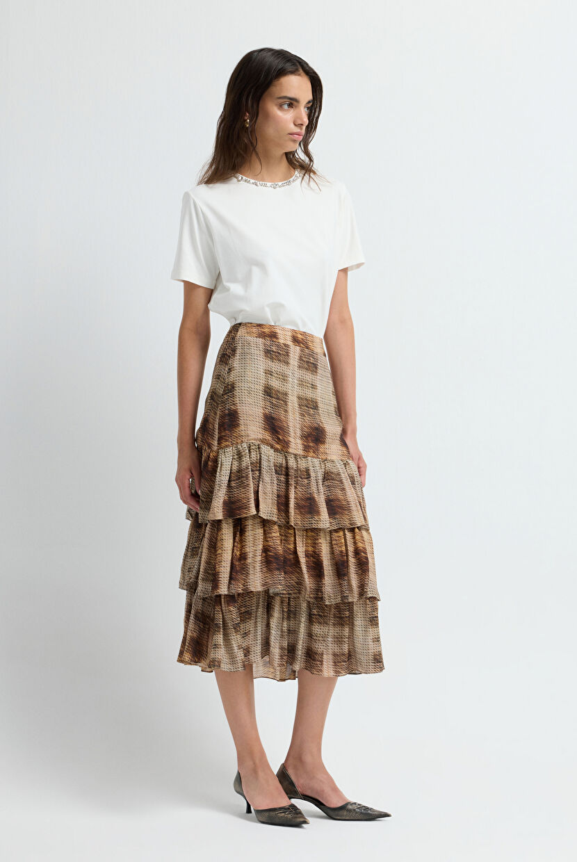 Flared skirts are designed using a variety of fabrics such as jersey, linen, cotton, and viscose, making them ideal for casual styling. Midi flared skirts can be paired with blouses, t-shirts, or knits for a stylish, relaxed look. For example, a black midi flared skirt matched with a flowy white blouse creates a smart office outfit, while pairing it with a white V-neck t-shirt results in casual chic.