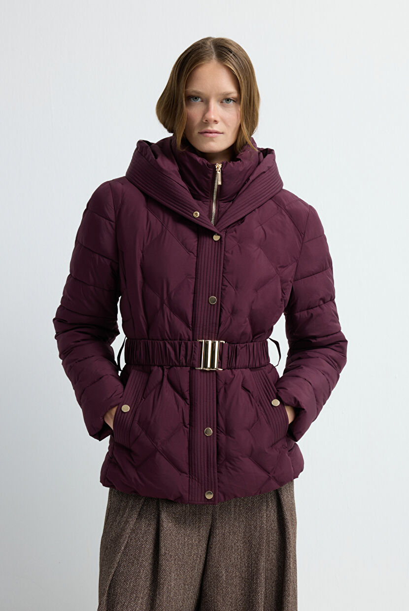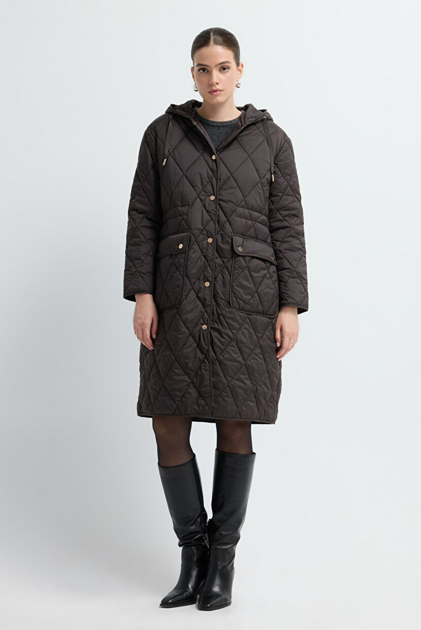 Brown Quilted Long Coat with Hood