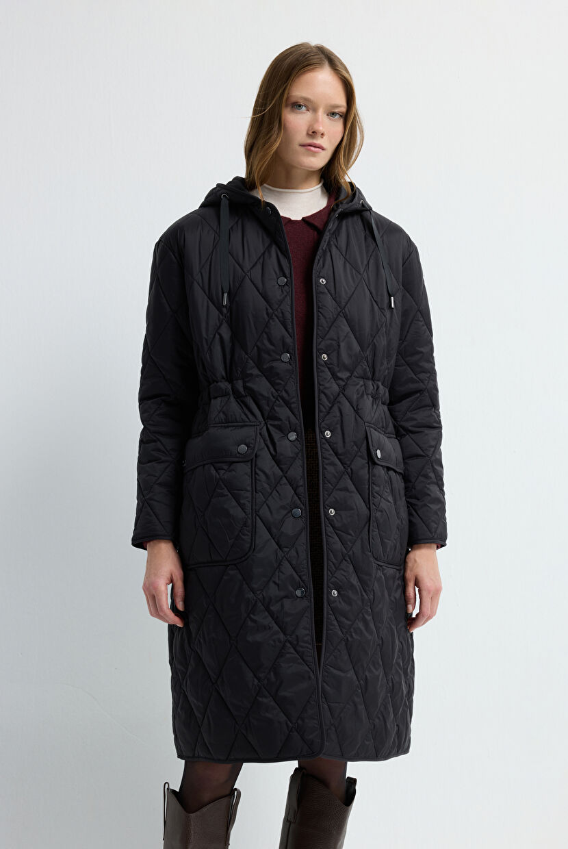 Black Quilted Long Coat with Hood