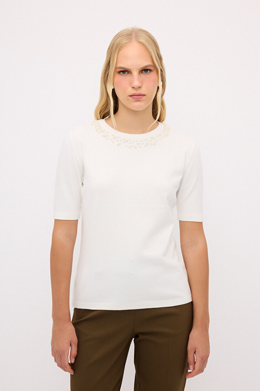 Bone Pearl Detailed Short Sleeve Knitwear Sweater