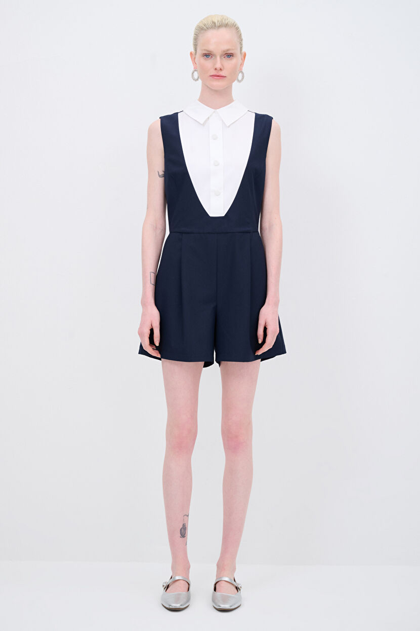 Navy Blue Sleeveless Mini Jumpsuit with Garni Detail