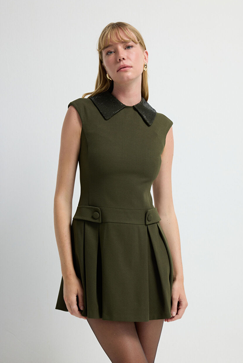 Khaki Gabardine Dress with Stone Detail on the Collar