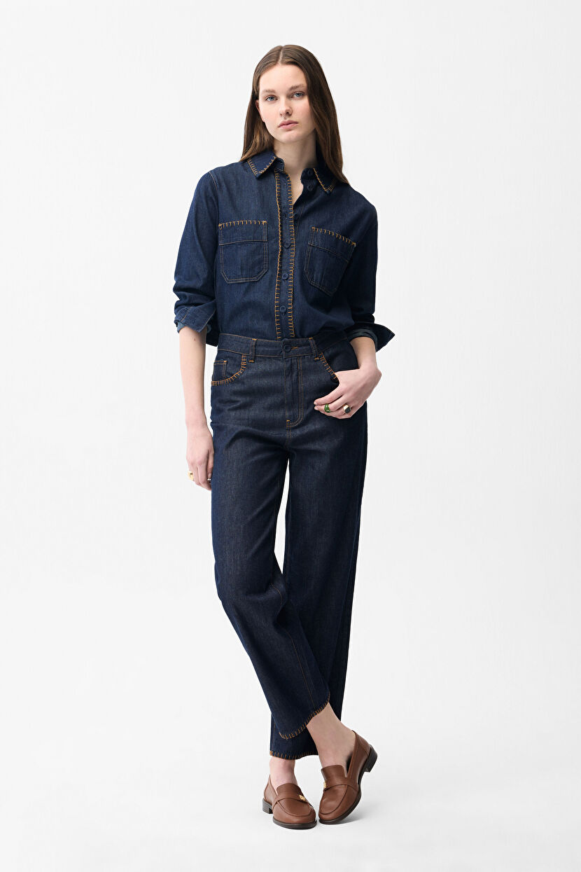 Navy Blue Denim Trousers with Stitching Details