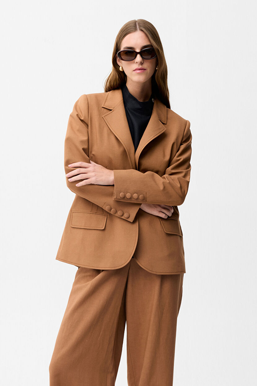 Camel Mono Closure Linen Jacket with Embroidery Details
