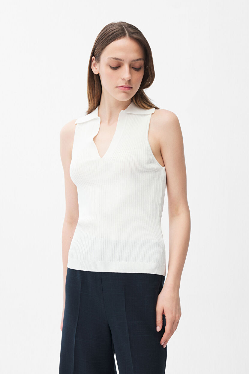 Bone Knitwear Blouse with Sleeveless Collar