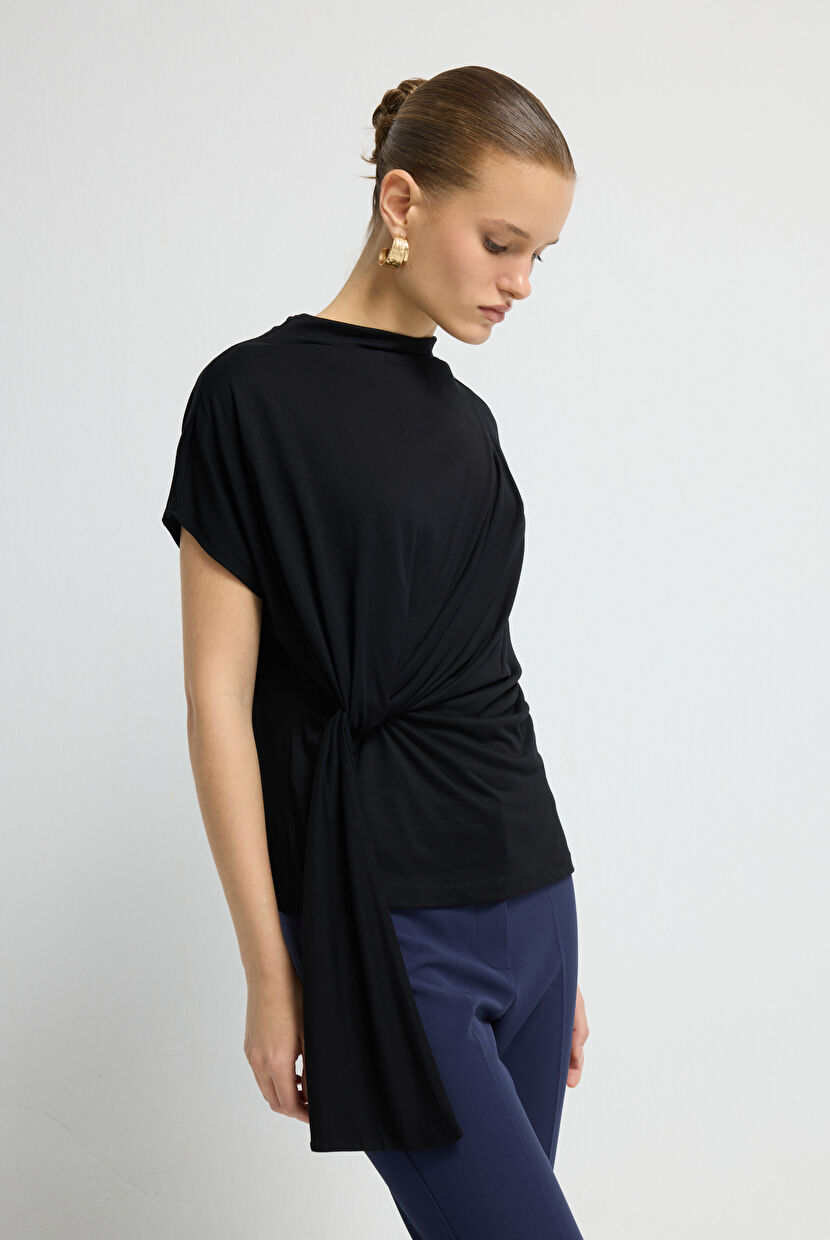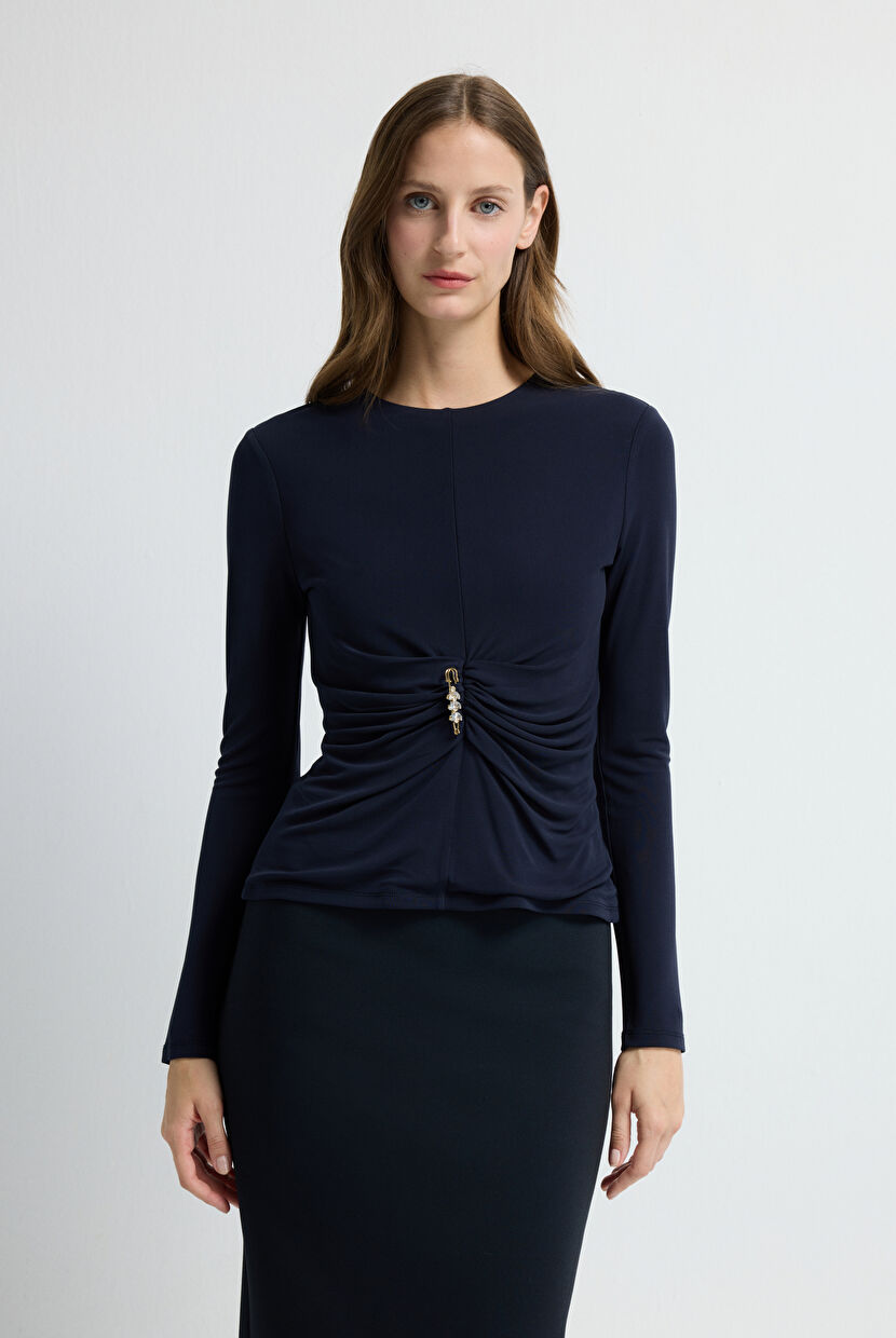 Navy Blue Knitted Gathered Detailed Blouse