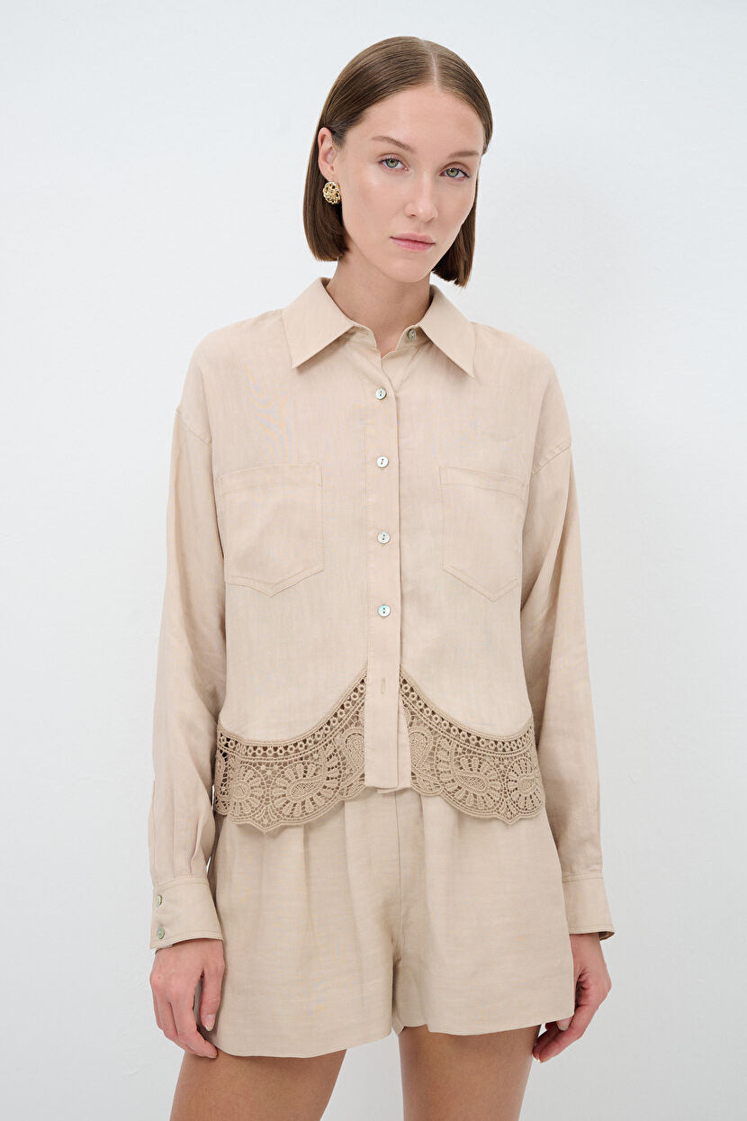 Beige Long Sleeve Lace Detailed Shirt
