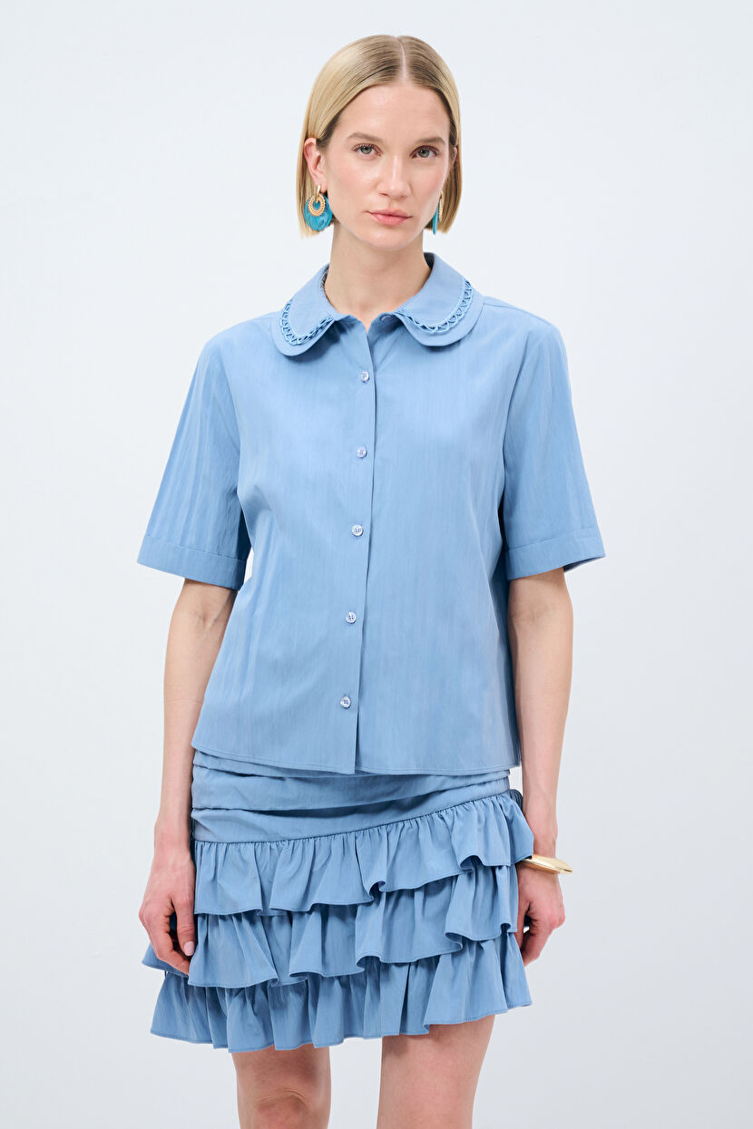 Blue Shirt With Banded Collar