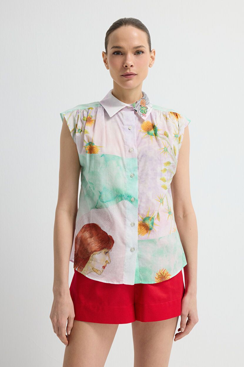 Green Patterned Sleveless Shirt