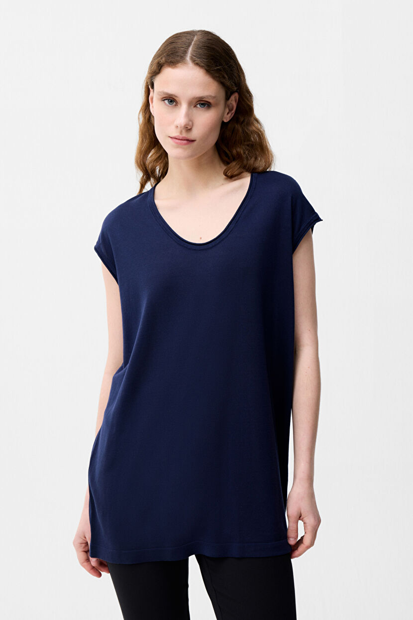 Navy Blue Short Sleeve Knitwear Blouse