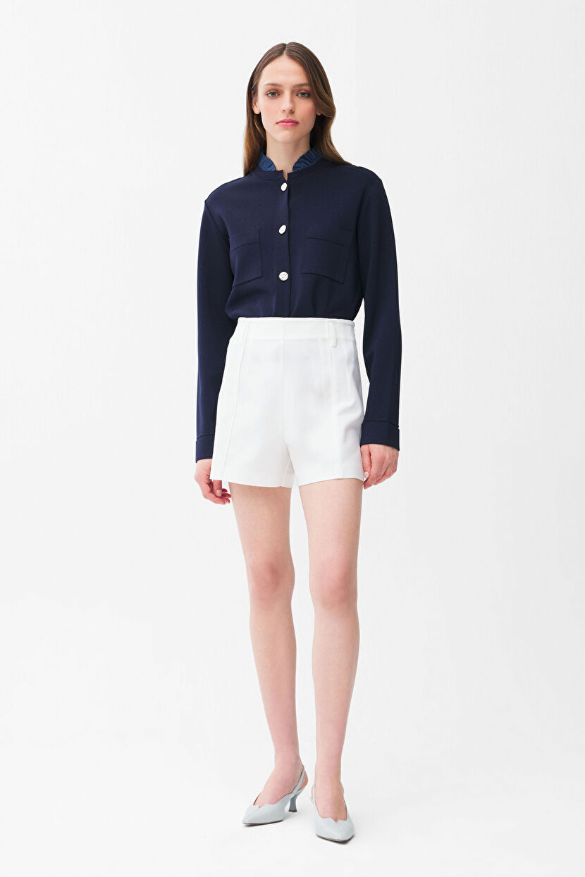 Navy Blue Knitted Cardigan with Denim Detail Collar