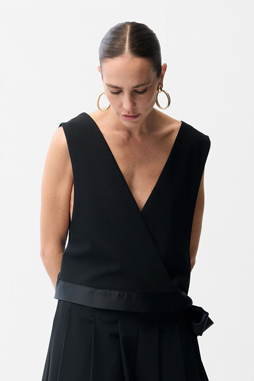 Black V Collar Satin Detailed Blouse