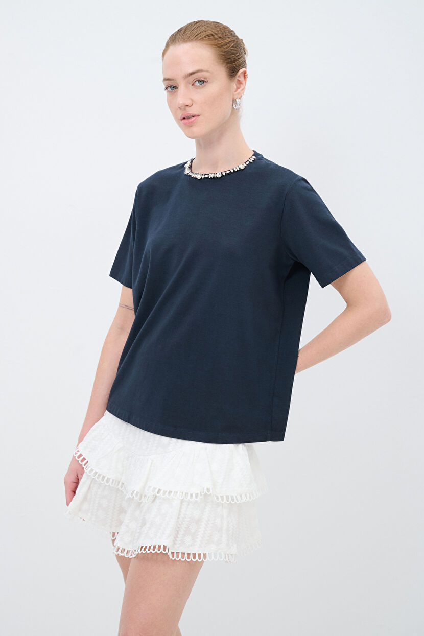 Navy Blue Short Sleeve Stoned Neck T-Shirt