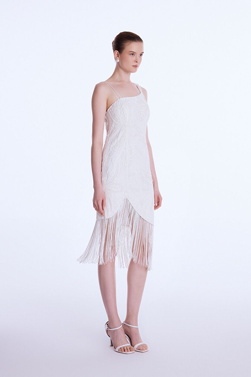 Beyaz Night Zoom Boncuk Detaylı Mini Elbise