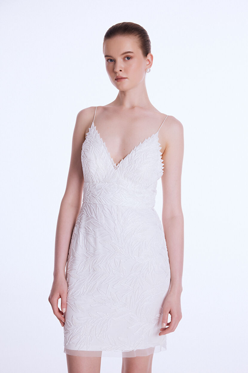 Beyaz Night Zoom V Yaka İşlemeli Mini Elbise