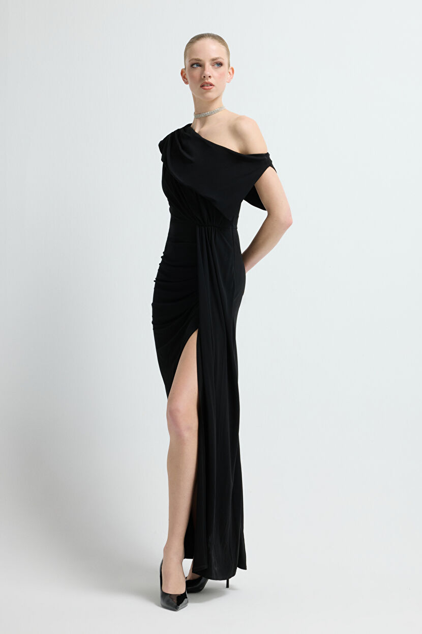 Siyah Yırtmaç Detaylı Örme Elbise