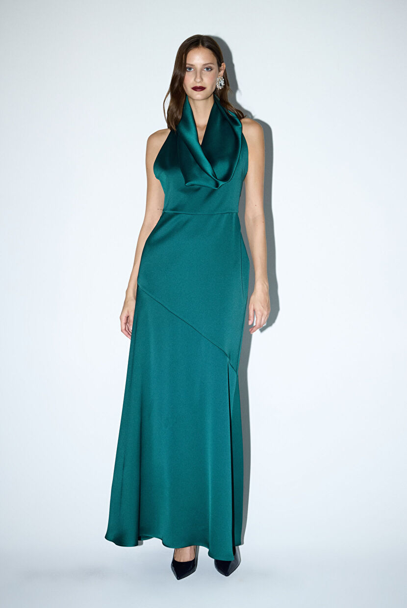 Yeşil Degaje Yaka Uzun Elbise