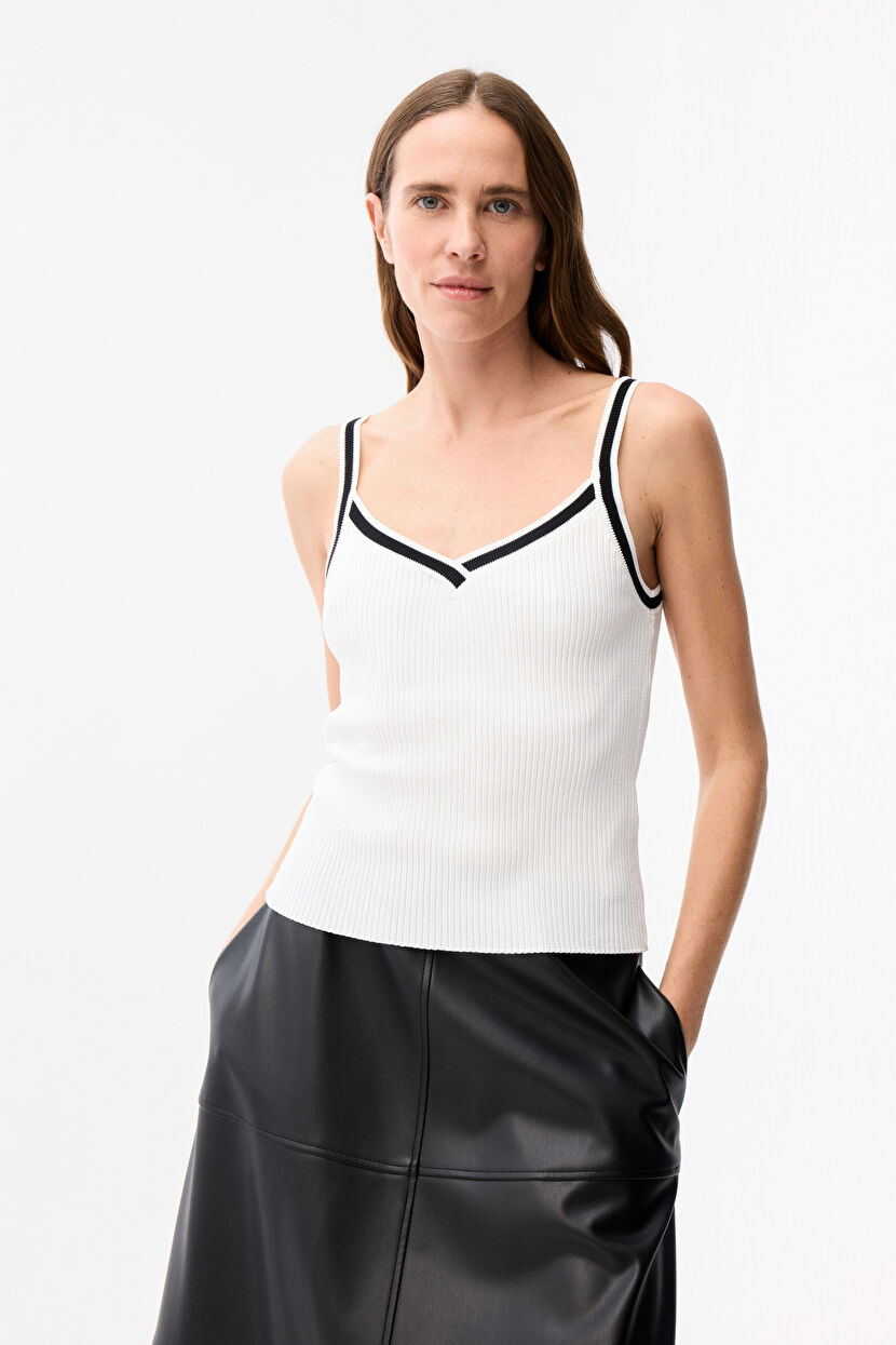 Beyaz Kontrast İp Askılı Triko Bluz