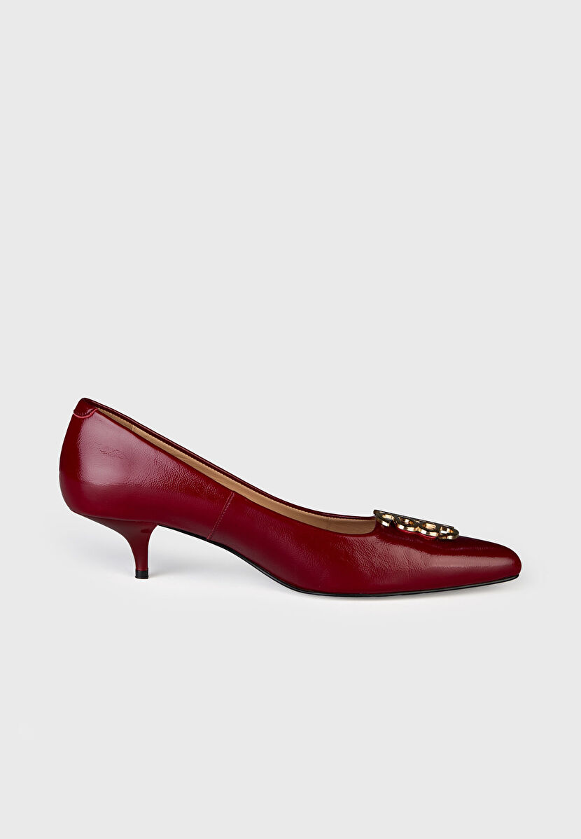 Bordo Deri Logolu Küçük Topuklu Ayakkabı