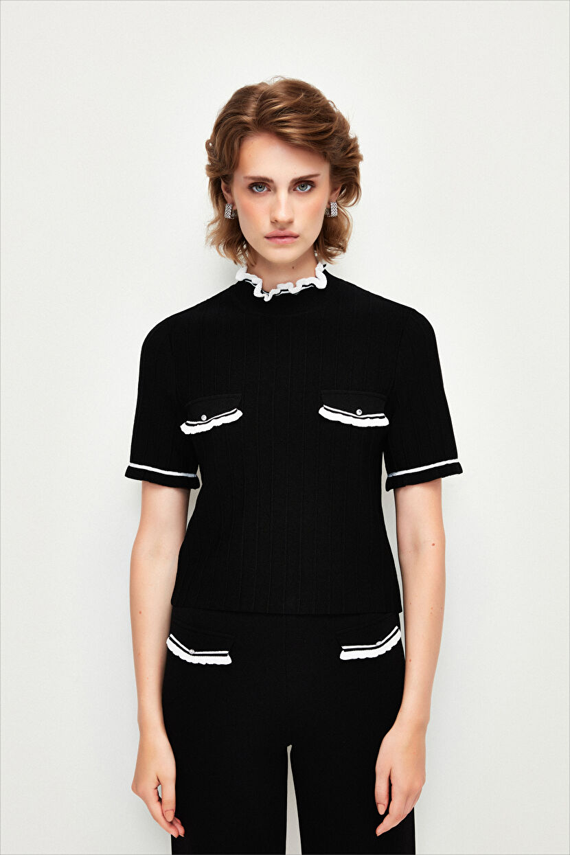 Siyah Bağlama Detaylı Dik Yaka Bluz