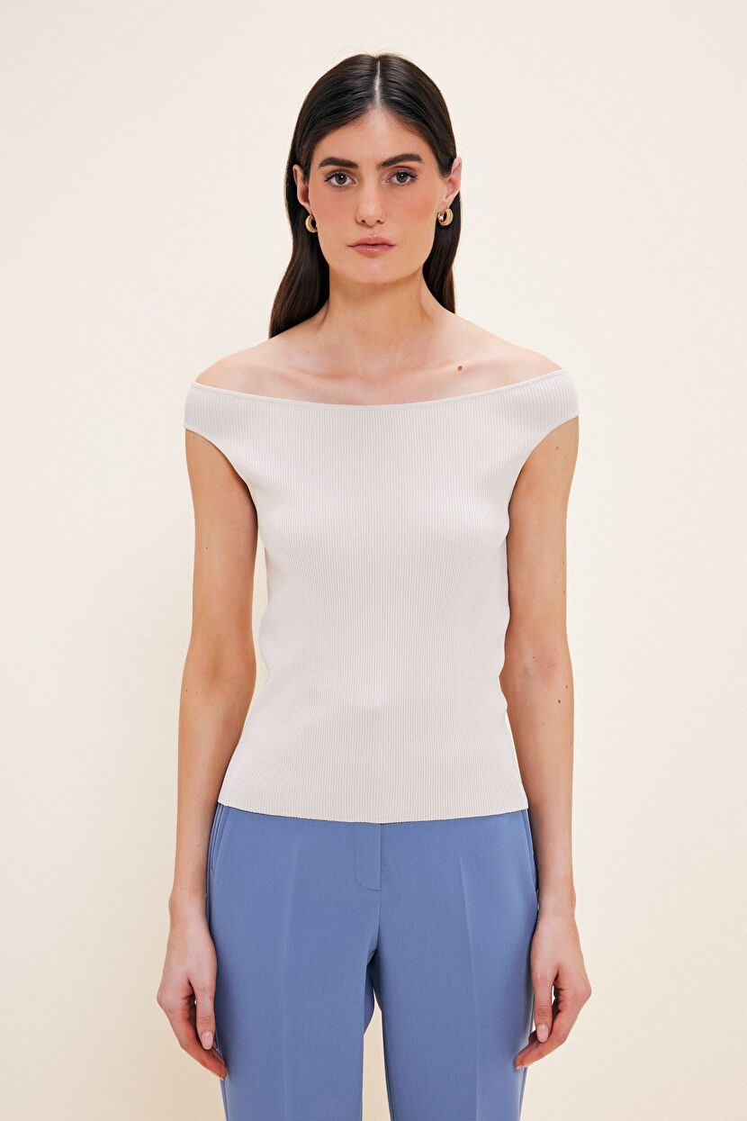 Bej Moda Tutkusu Düşük Omuz Triko Bluz