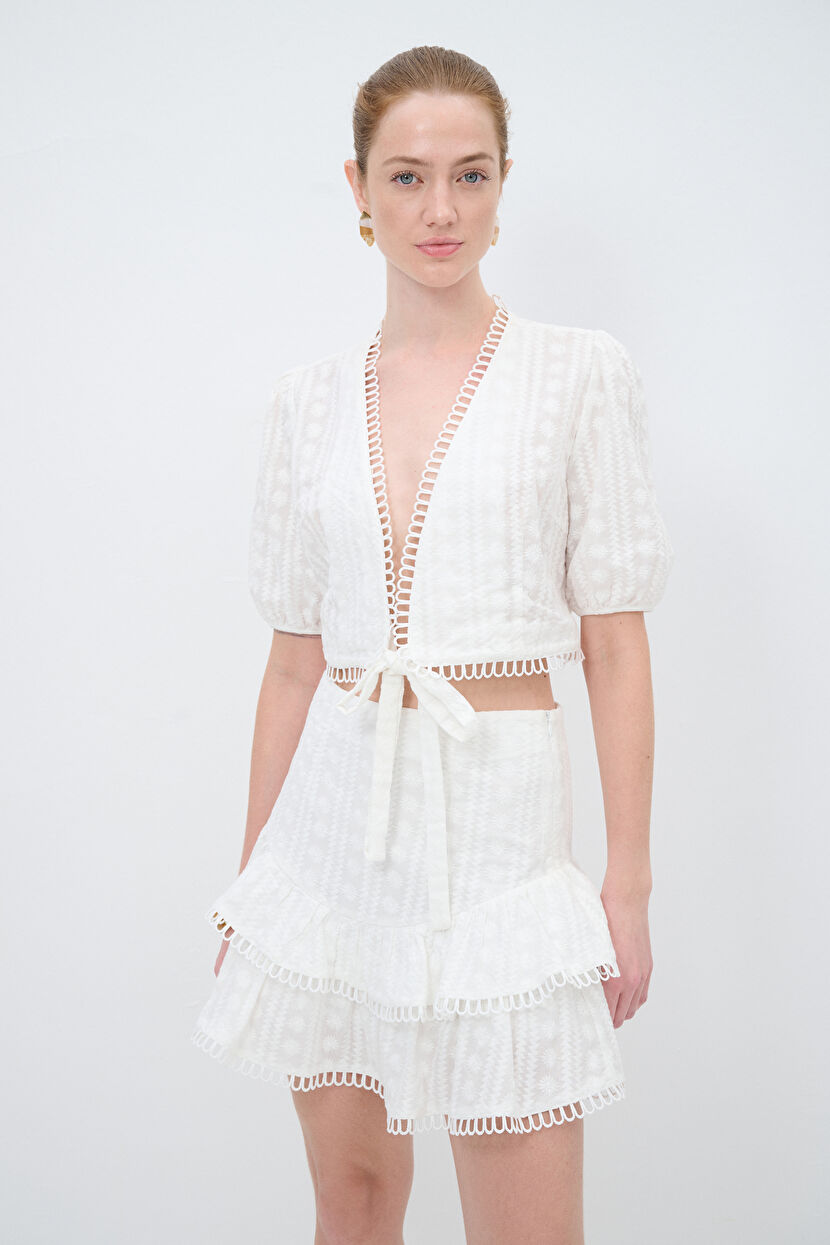 Beyaz Volanlı Dantel Detaylı Mini Etek