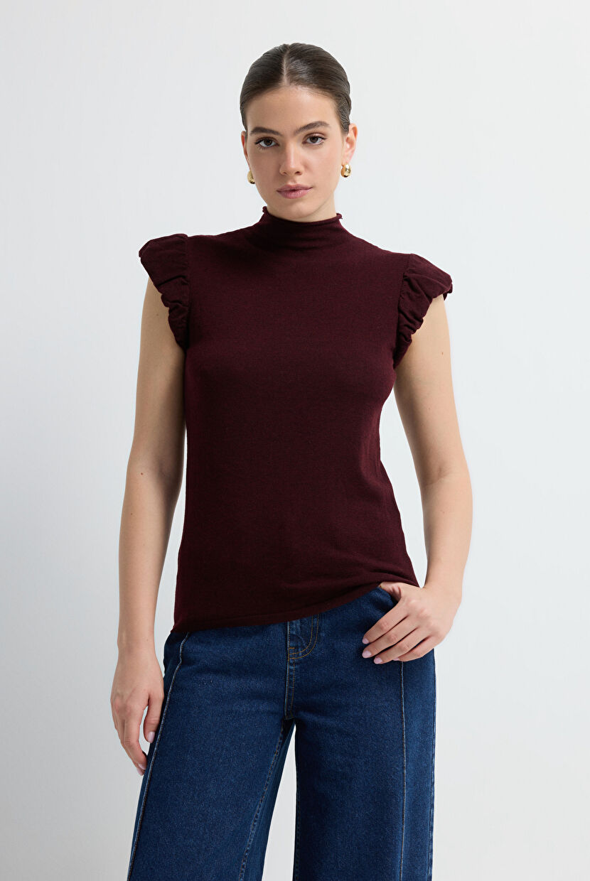 Bordo Kolu Fırfırlı Yün Karışımlı Triko Bluz