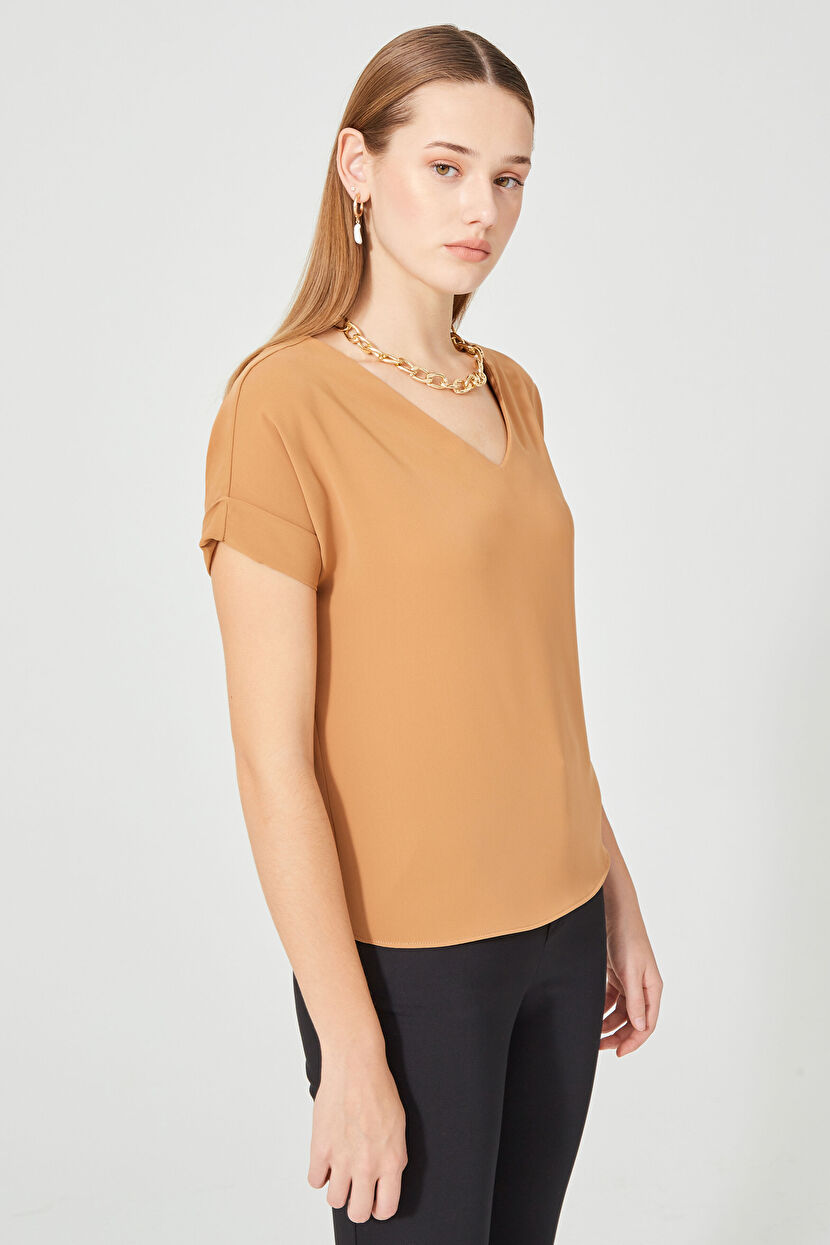 Camel Kısa Kollu V Yaka Bluz