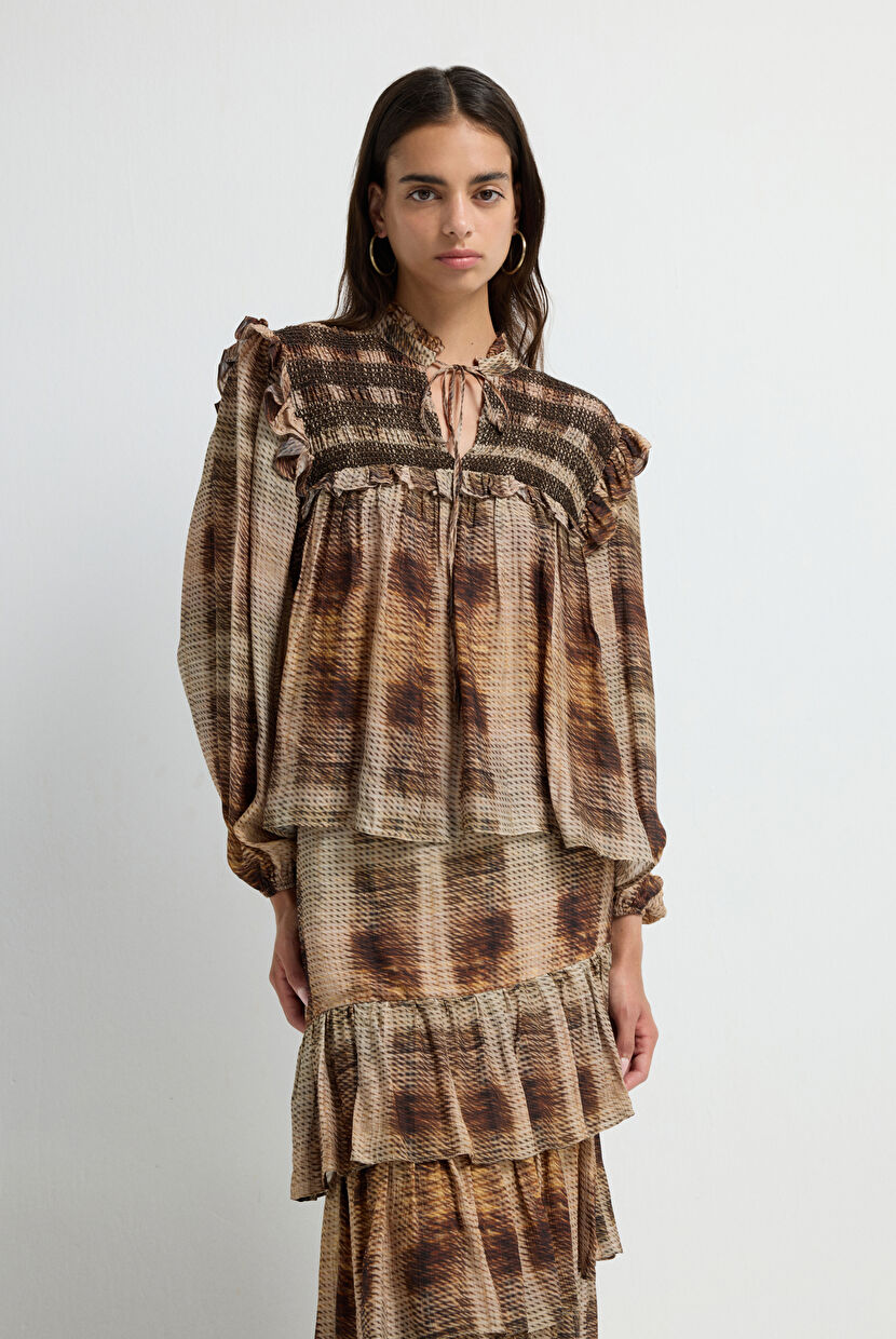 Kahverengi Büzgü Detaylı Uzun Kollu Bluz