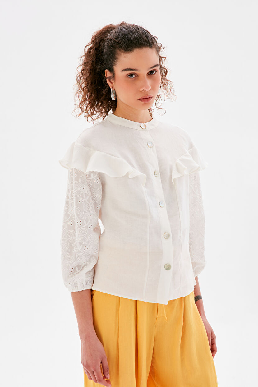 Kemik Fırfırlı Kolları Brodeli Bluz