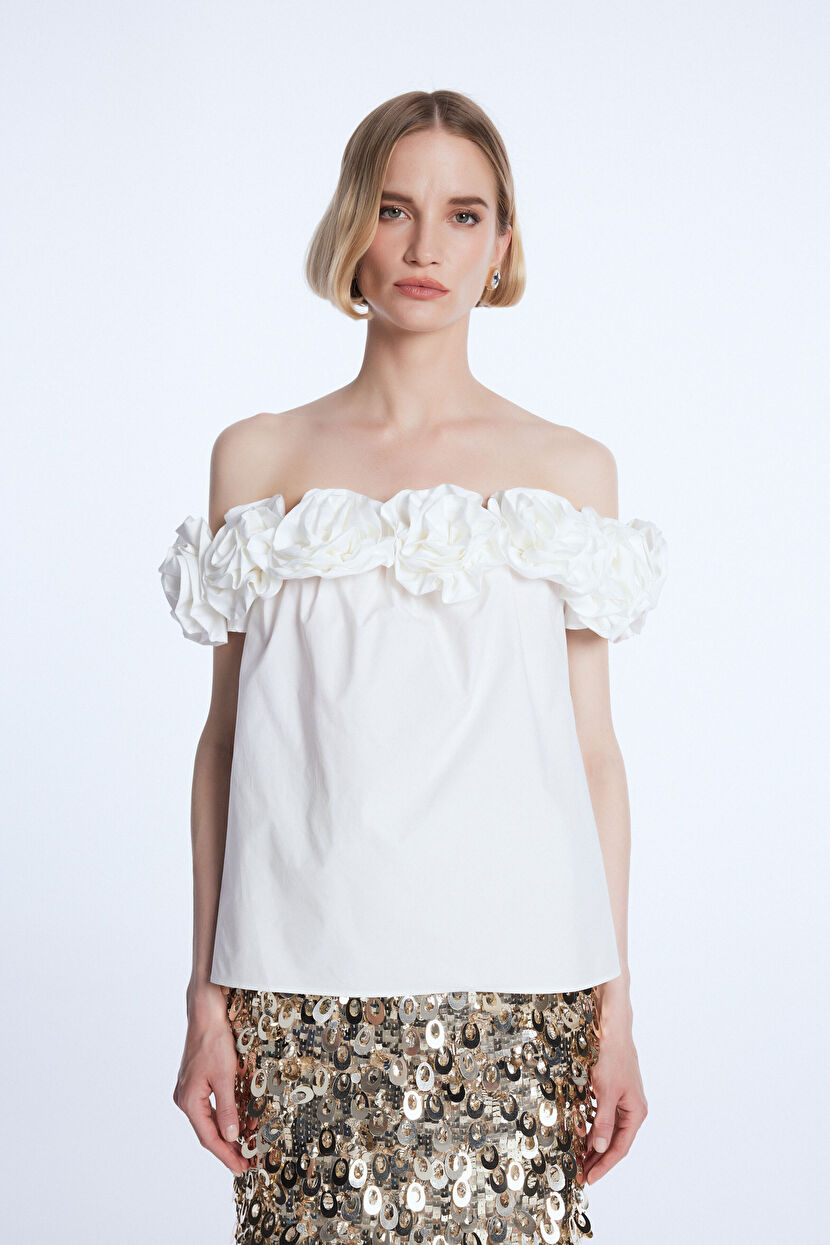 Kemik Mert Aslan Omuzları Gül Aksesuarlı Bluz