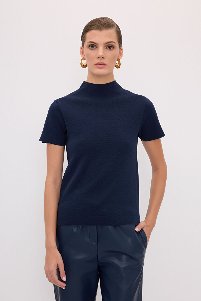 Lacivert Boğazlı Kısa Kol Triko Bluz