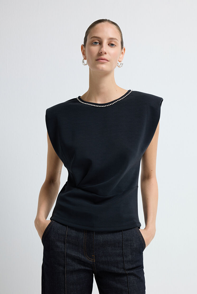Lacivert Yakası Taşlı Bluz