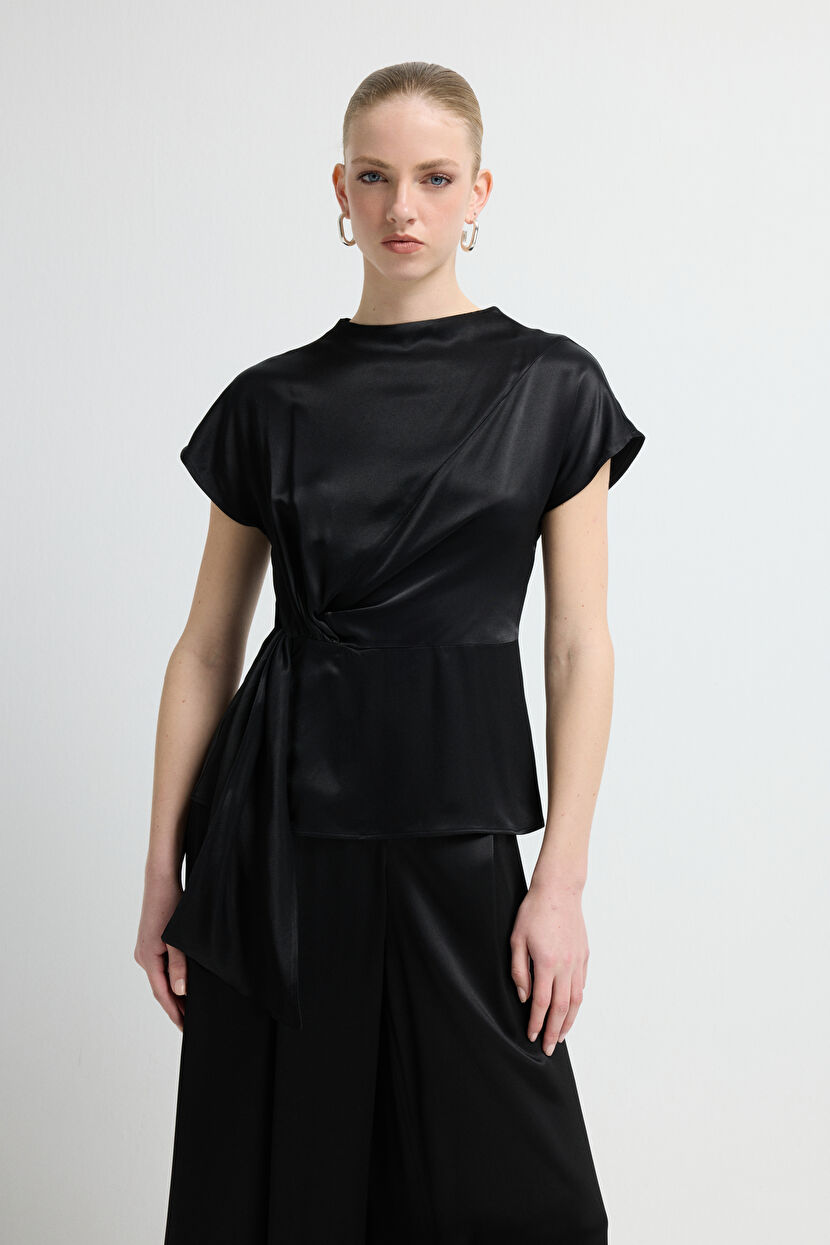 Siyah Bağlama Detaylı Dik Yaka Bluz