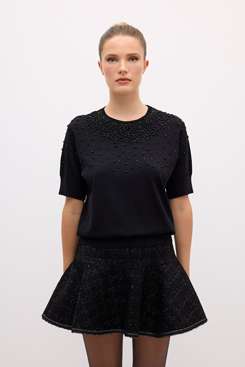 Siyah Mert Aslan Taşlı Triko Bluz