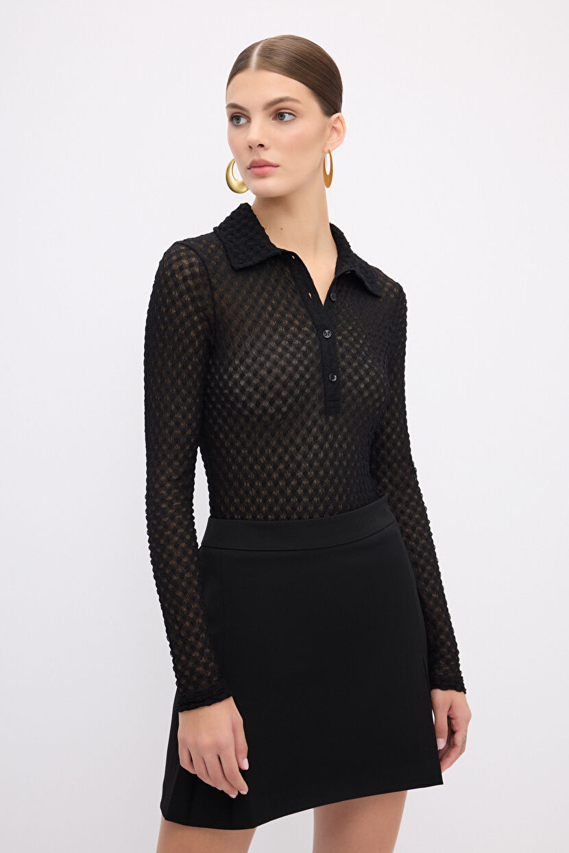 Siyah Uzun Kol Gömlek Yaka Dantel Body