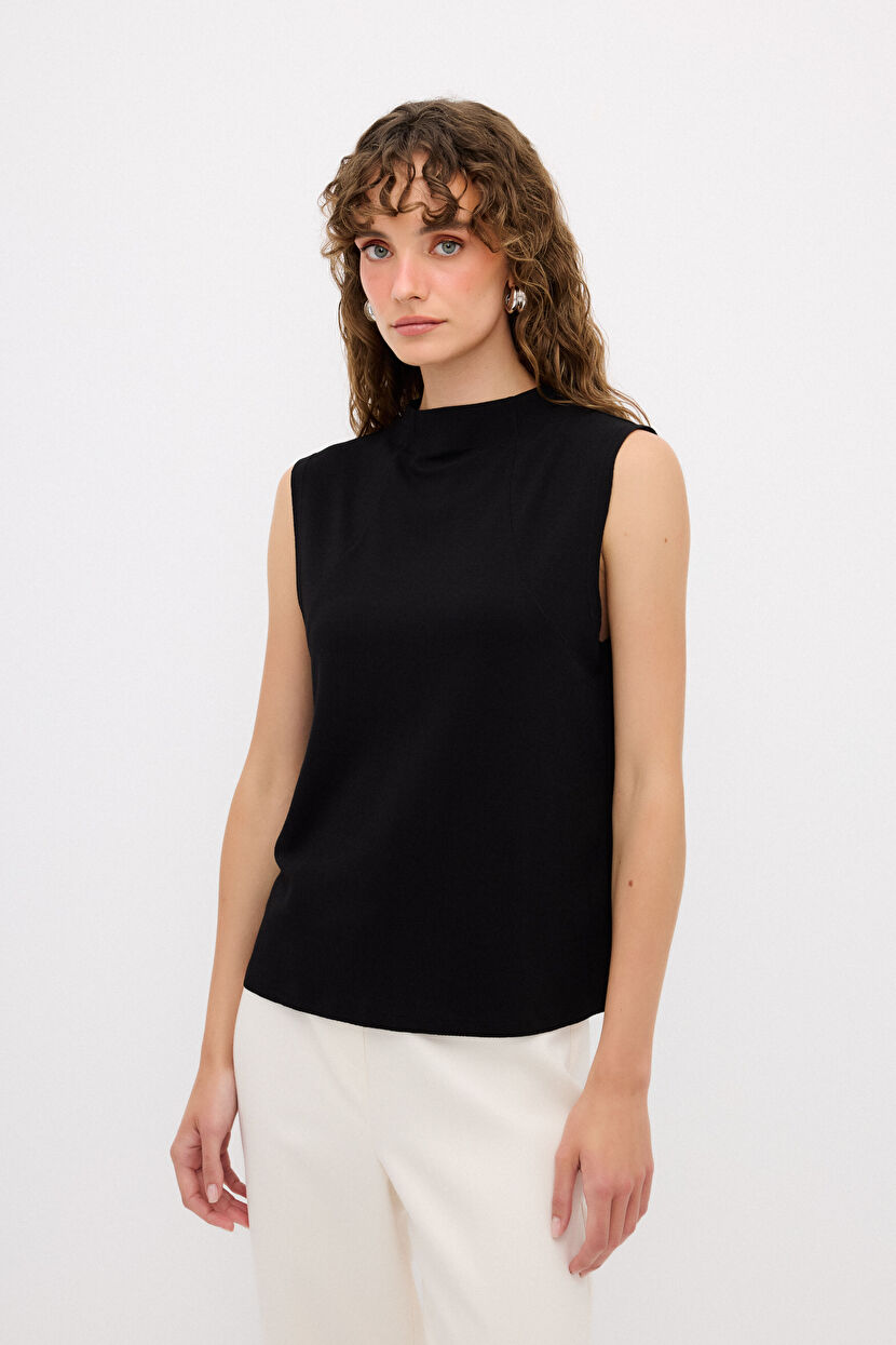 Siyah Yakası Fermuarlı Sıfır Kollu Örme Bluz