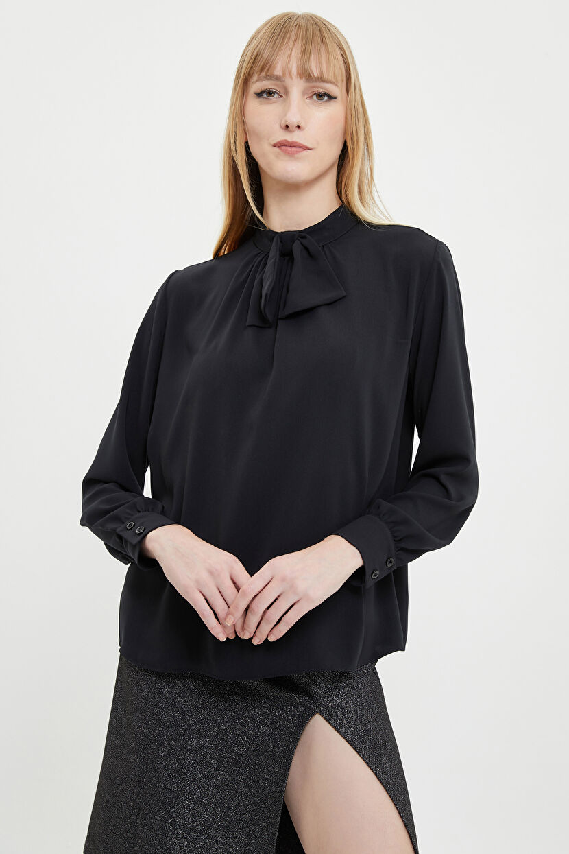 Siyah Yakası Fiyonklu Büzgülü Bluz
