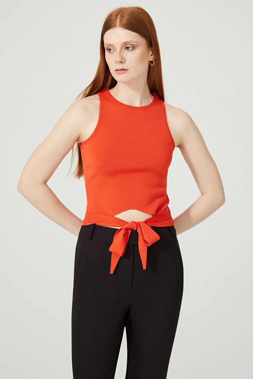 Turuncu Önü Bağlamalı Crop Triko Bluz