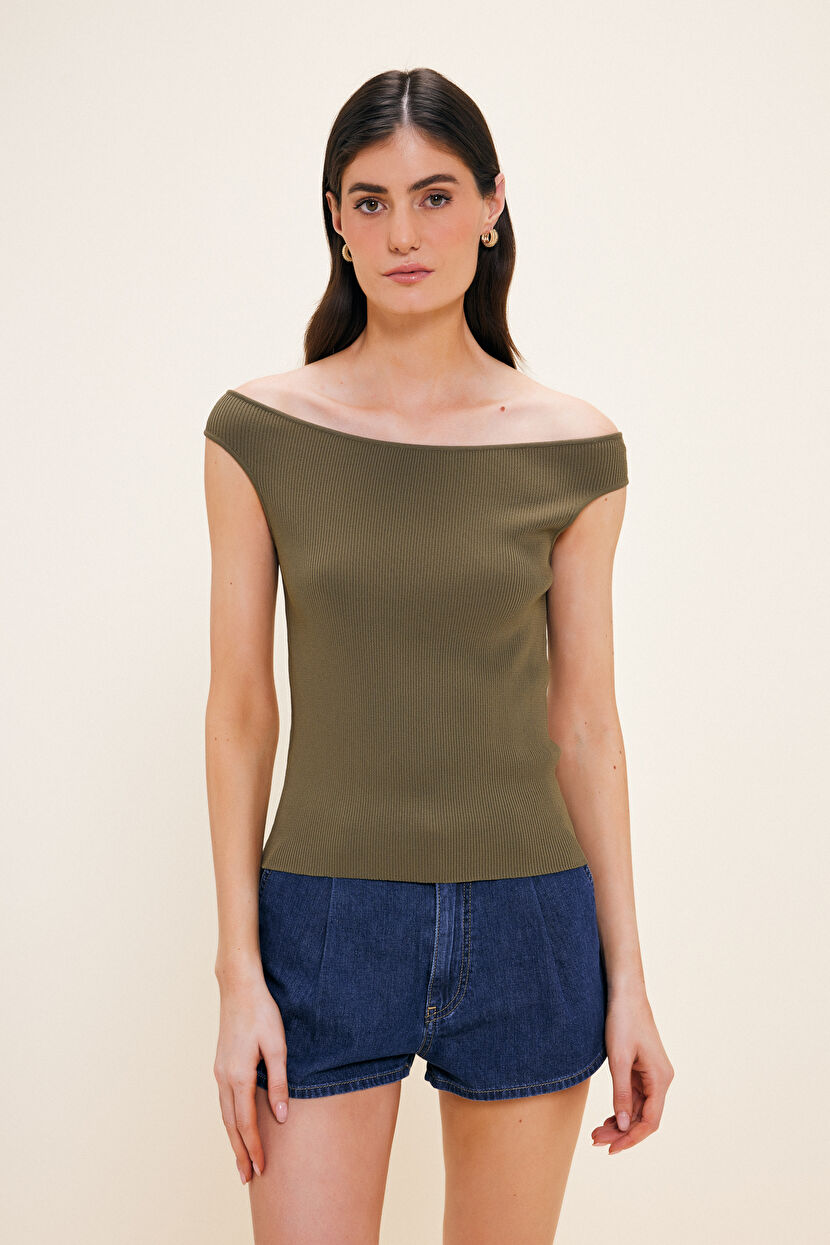 Yeşil Moda Tutkusu Düşük Omuz Triko Bluz