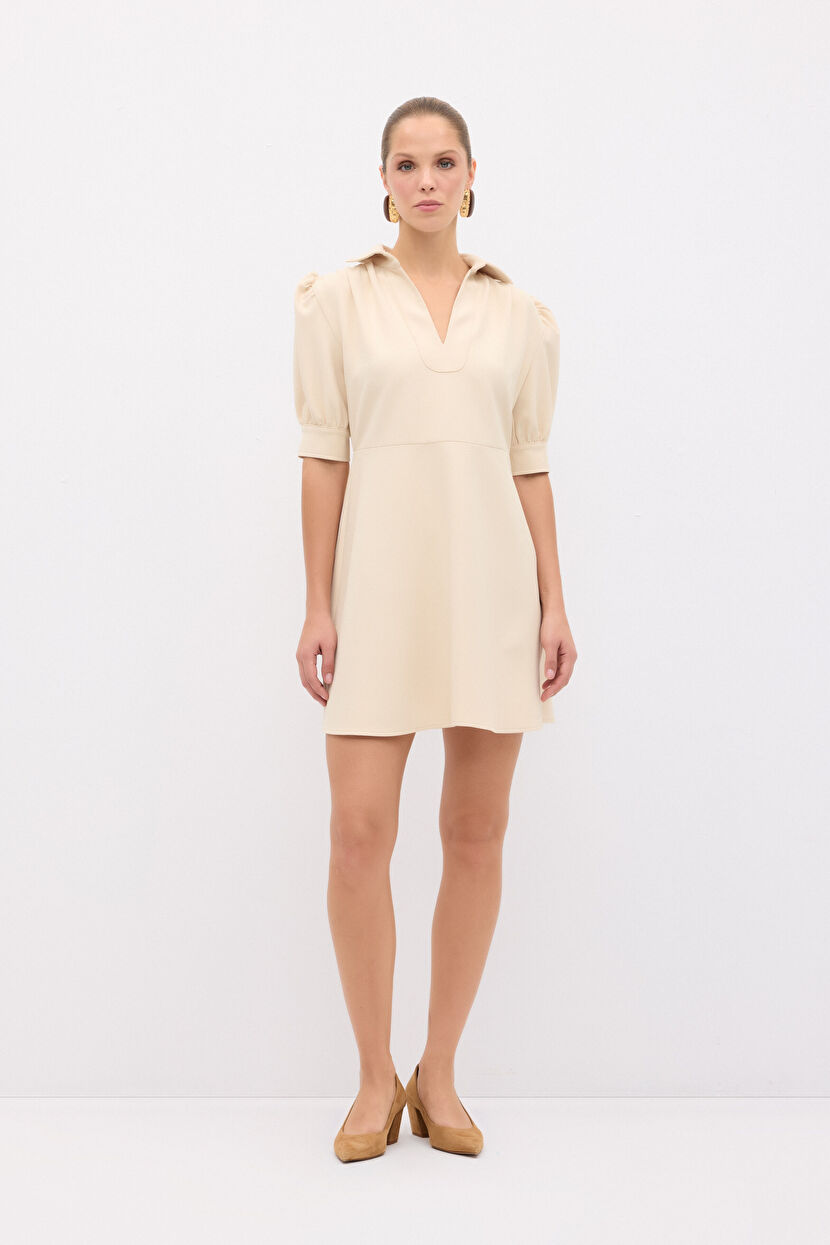 Bej Erkek Yaka Balon Kollu Mini Elbise