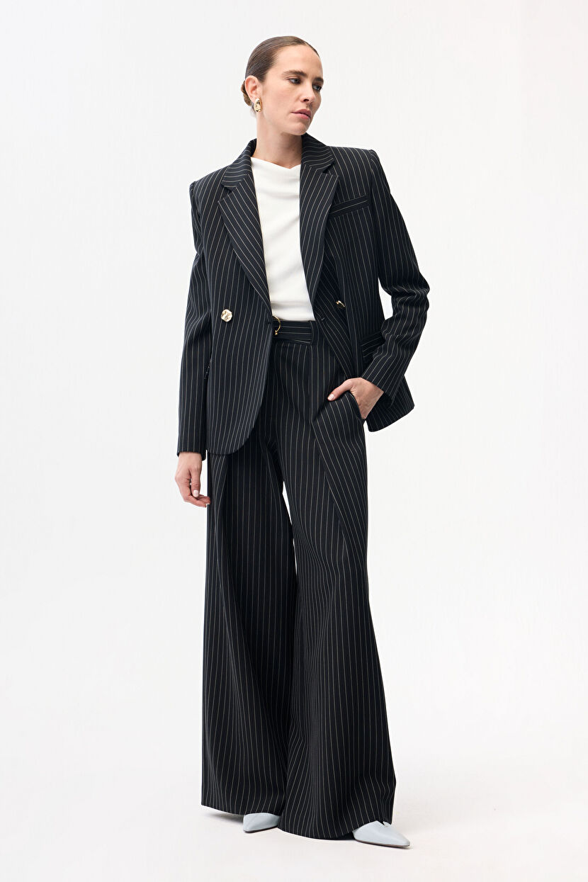 Siyah Pile Detaylı Çizgili Pantolon