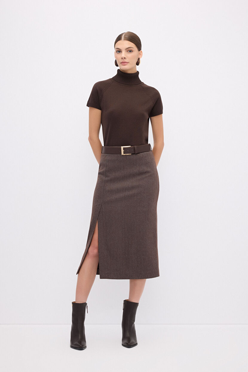 Kahverengi Yırtmaçlı Midi Etek