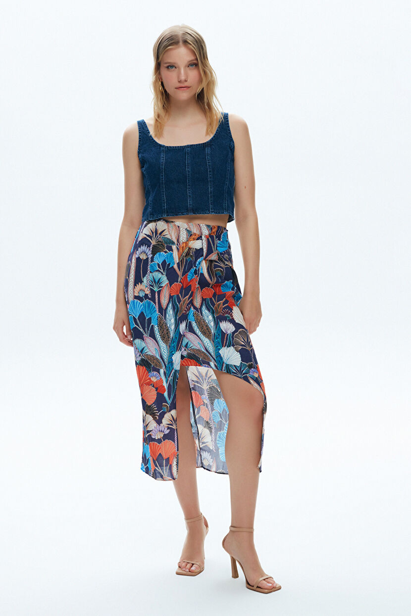 Mavi Buff Fiyonk Detaylı Desenli Keten Etek