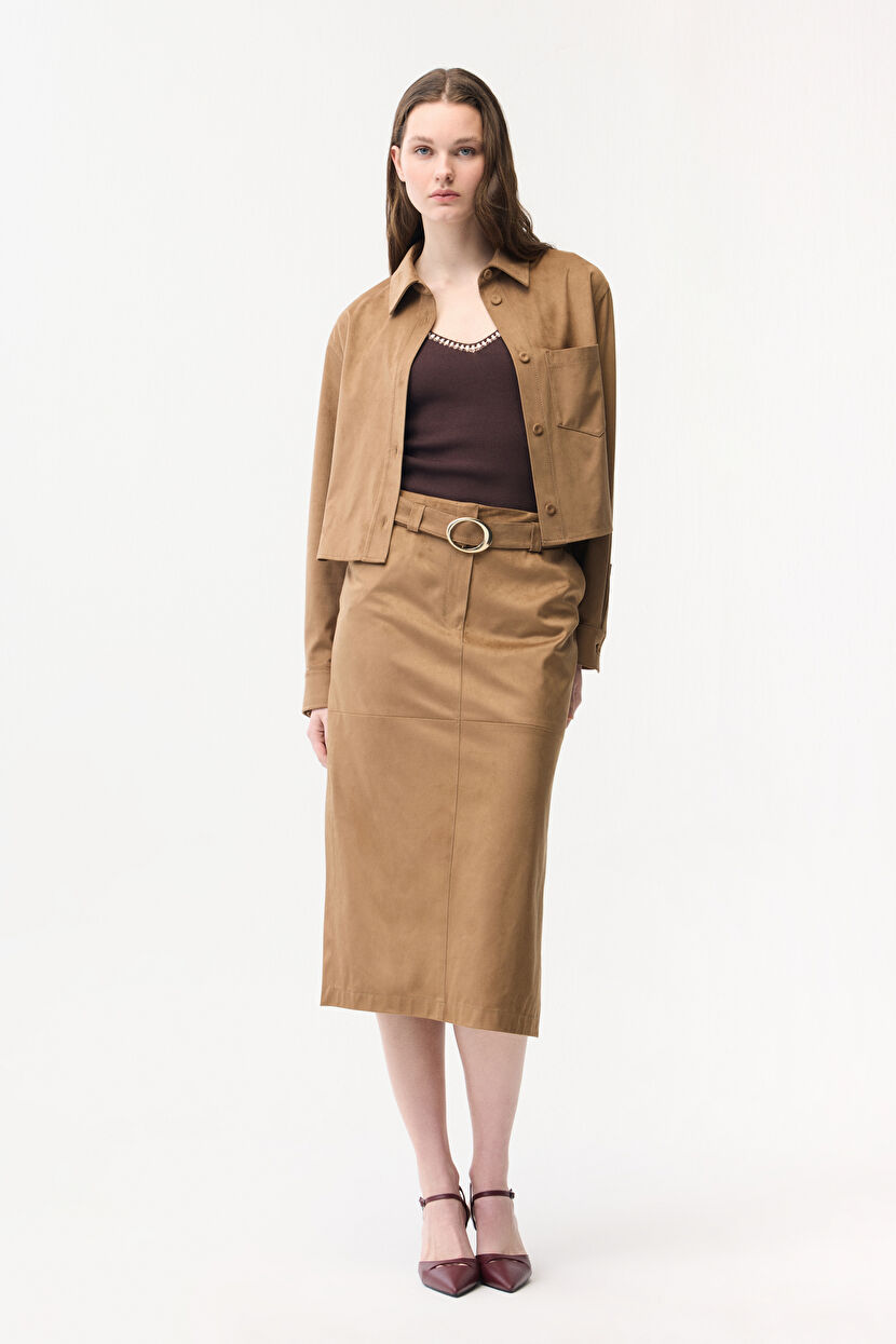 Vizon Yırtmaç Detaylı Süet Etek