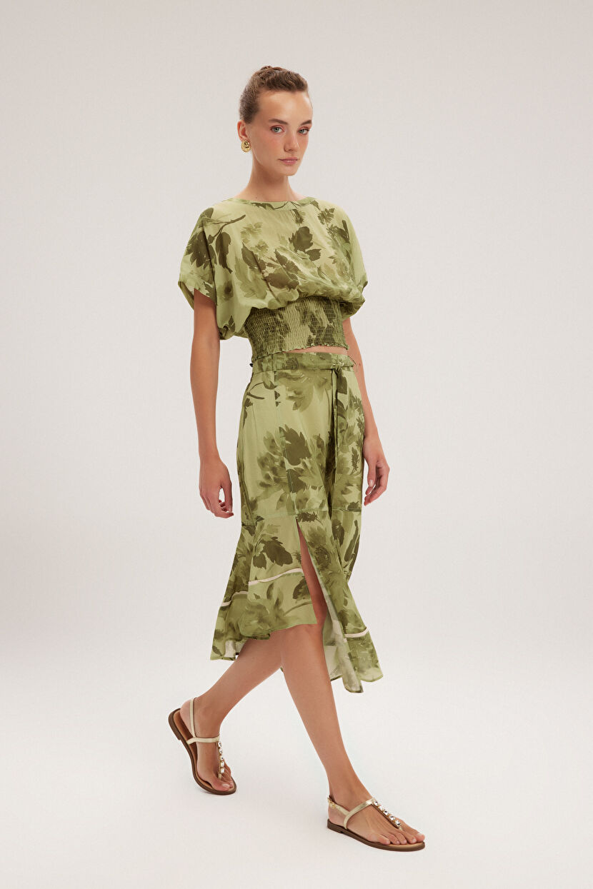 Yeşil Yırtmaçlı Desenli Etek